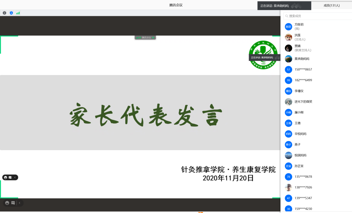新生們的點滴進步承載着家長的辛勤付出,構建良好的家校聯合機制更需要依托家長的信任和支持。2020級中醫康複專業莫承勳同學的媽媽作為新生家長代表發言,她對學院老師在學生教育管理方面的付出表示感謝,并闡述了家庭監督、家校溝通對于大學生成長的重要作用,她表示此次線上家長會是一次新穎而又意義深刻的活動,希望今後與學院老師繼續保持深入溝通,家校攜手為新生成長助力。