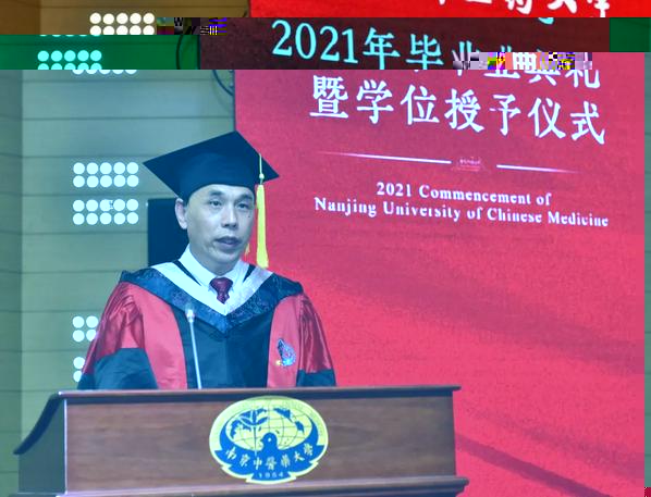 典禮上,學院院長、院學位評定委員會主席倪光夏教授代表學院向全體畢業生順利完成學業并分别獲得學士、碩士、博士學位表示熱烈祝賀,向辛勤哺育學生成長的父母及悉心指導他們的老師們表示衷心的感謝和崇高的敬意。他在講話中指出,學校“雙一流”建設成績斐然,今年我院針灸推拿學、康複治療學入選國家級一流本科專業建設點;我院辦學專業涵蓋未病先防、治療、康複等生命全周期,開啟了大健康時代快速發展新的裡程碑,這些成就離不開每一位南中醫人的辛勤付出與共同努力。在畢業生們即将開啟人生新的内容、新的征程、新的目标之際,他對全體畢業生提出了三點希望:一是心系祖國,責任擔當。希望同學們将個人理想融入國家和民族發展浪潮,将個人的價值在為報效祖國、服務社會中得到升華,懸壺濟世、救死扶傷,肩負起作為白衣戰士對全人類健康的責任與擔當。二是自強奮進、樂于奉獻。希望同學們牢記自信、敬業的校訓,用以中醫精神為核心的價值理念作為人生道路的引航,以奮進和奉獻作為青春的底色,時刻銘記“健康所系、性命相托”的誓言,傾盡所學,為攻克人類健康道路上的難關貢獻南中醫智慧和力量。三是德藝雙馨、追求卓越。希望同學們時刻秉持仁德、仁心、仁術,在發揚中醫藥事業的道路上大膽開拓、不斷前行、追求卓越,做醫德高尚、醫術精良的白衣戰士,奮力書寫健康中國新篇章。