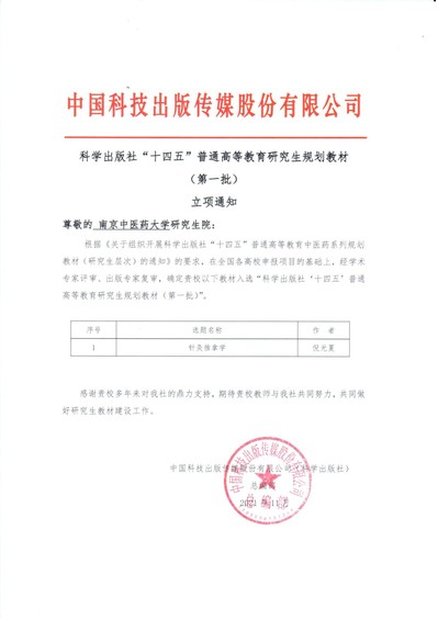 我校研究生院近日接到科技出版社的通知,我院倪光夏教授申報的《針灸推拿學》教材獲得科學出版社“十四五”普通高等教育研究生規劃教材立項(第一批),該項目也是我校獲得科學出版社“十四五”普通高等教育研究生規劃教材立項(第一批)的唯一項目。