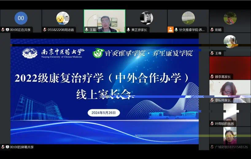 為進一步加強優良學風建設,助力學生成長成才,形成崇學尚學的良好學習氛圍。5月26日,我院召開2022級康複治療學(中外合作辦學)線上家長會。學院康複治療學教研室主任王磊,學業指導教師彭娟娟、王尊,輔導員劉佳章及全體2022級學生家長參加會議。會議由輔導員方玲玲主持。