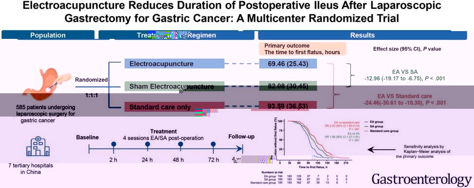 該研究采用多中心随機對照試驗設計,由江蘇省中醫院、四川大學華西醫院、溫州醫科大學附屬第一醫院、南京鼓樓醫院、上海中醫藥大學附屬嶽陽中西醫結合醫院、湖南中醫藥大學第一附屬醫院和江蘇省蘇北人民醫院共7家三甲醫院共同完成,共納入585名接受腹腔鏡胃癌切除術的患者。所有參與者均接受圍手術期标準護理,并被随機分配至電針組、假電針組或僅标準護理組。研究采用标準化針刺治療方案,選取雙側内關、足三裡、上巨虛穴,術後連續治療4天,每次留針30分鐘。研究結果顯示,與假電針組和僅接受标準護理的患者相比,電針治療顯著縮短了首次排氣時間和首次排便時間,并降低了延遲性術後腸麻痹的發生率。該研究為針灸促進腹腔鏡胃癌術後康複的有效性提供了科學依據,也為在國際上推廣加速康複外科提供了中國針灸方案及循證證據。